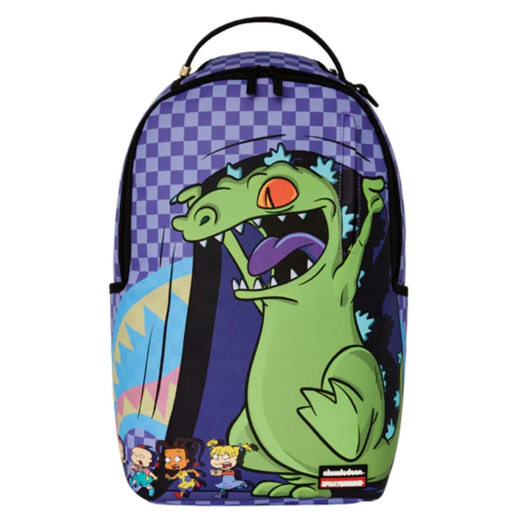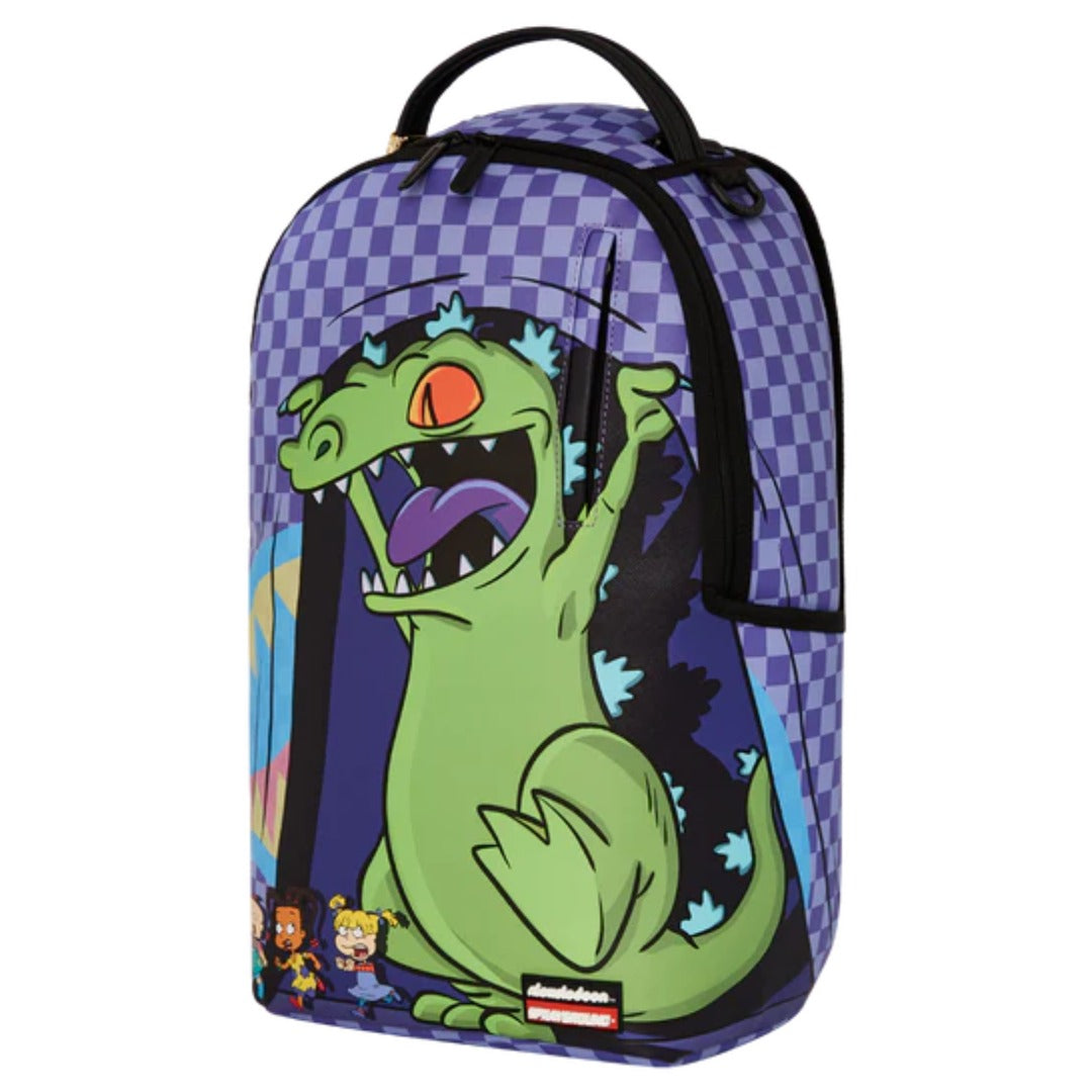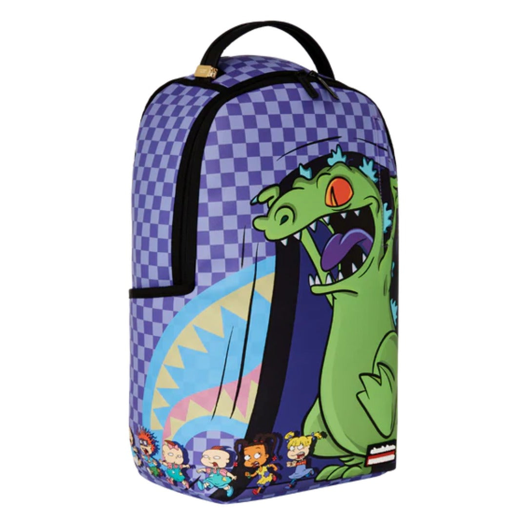 The Sprayground Rugrats Reptar Chase DLXSV Backpack brings nostalgic fun and bold style together in one eye-catching design. Featuring the legendary Reptar chasing through vibrant Rugrats-themed artwork, it captures the playful energy of the beloved cartoon. Crafted with durable, water-resistant polyester, this backpack offers a padded laptop sleeve, spacious compartments, and hidden stash pockets for secure storage. Perfect for school, travel, or everyday adventures, it combines functionality with a statement-making design that Rugrats fans will love.